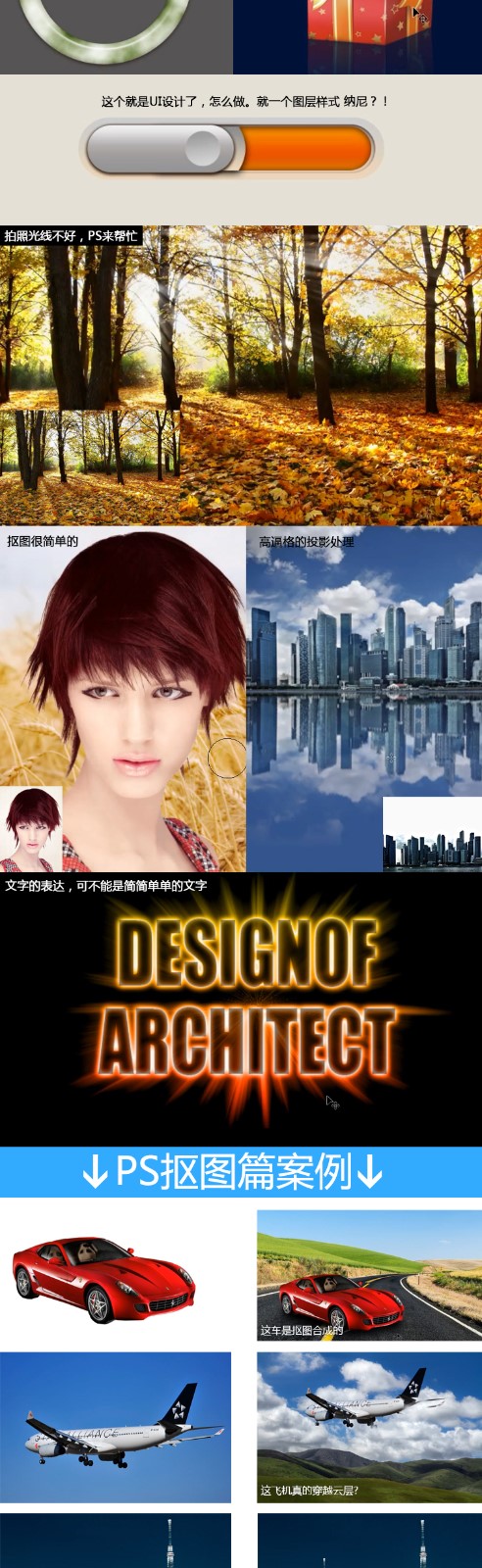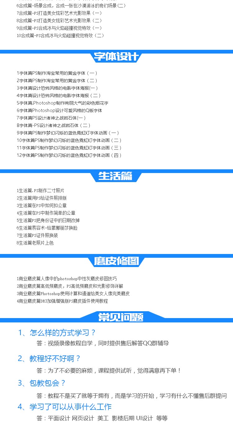 【课程内容】:教学主要分6大部分PS基础篇、 PS抠图篇、PS合成篇、PS字体设计篇、PS生活篇、PS磨皮篇